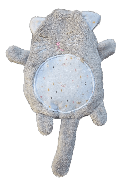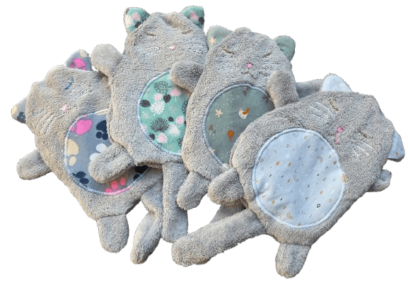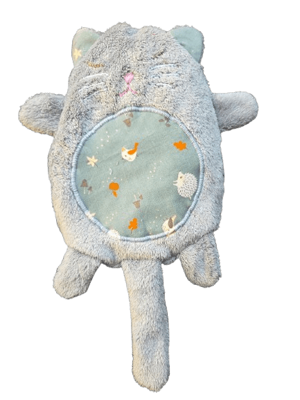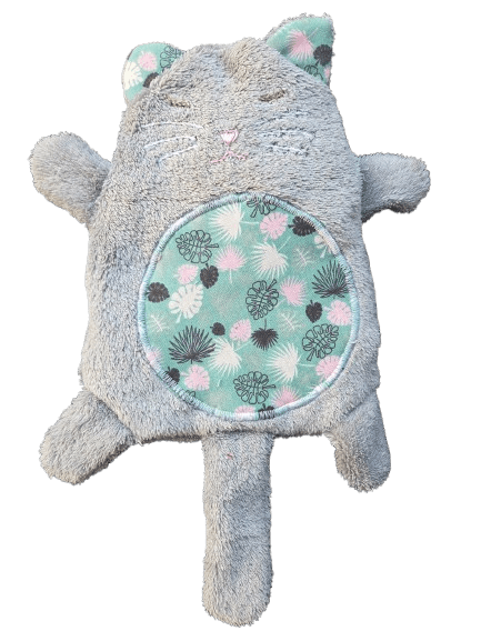 Bouillotte sèche en forme de petit chat, garnie de noyaux de cerises.