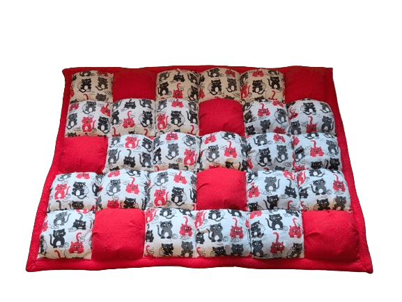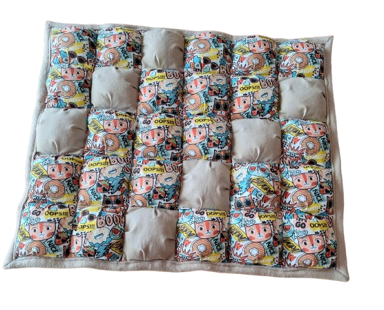 Composé au dessus de tissu coton, chaque carré étant cousu individuellement et garni de ouate oeko tex. Les bulles sont ensuite disposées et assemblées pour former cet agréable dodo. Le dessous du tapis est en tissu polaire.
